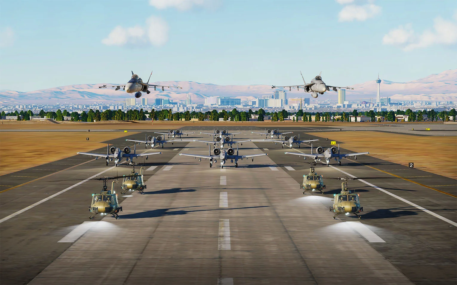 Eine UH-1H der 2. "Blade Riders" während einer Übung zum Absetzen von Bodentruppen über der Nellis AFB. Im Hintergrund: eine A-10C der 1. "Black Dragons" im Endanflug. Nellis AFB, 2021. Rakuzard.