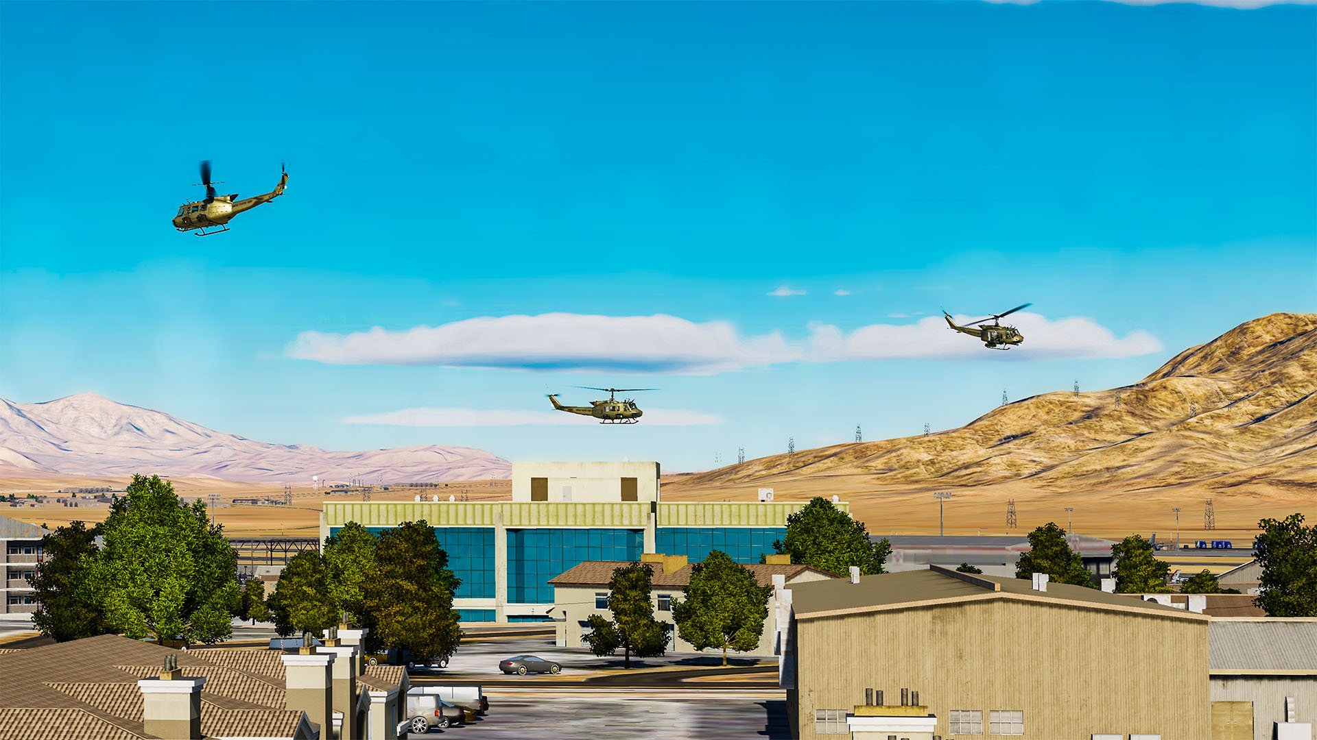Zwei UH-1H der 2. "Blade Riders" fliegen einen Orbit um eine dritte UH-1H, die Bodentruppen auf einem Dach absetzt. Nellis AFB, 2021. Rakuzard.